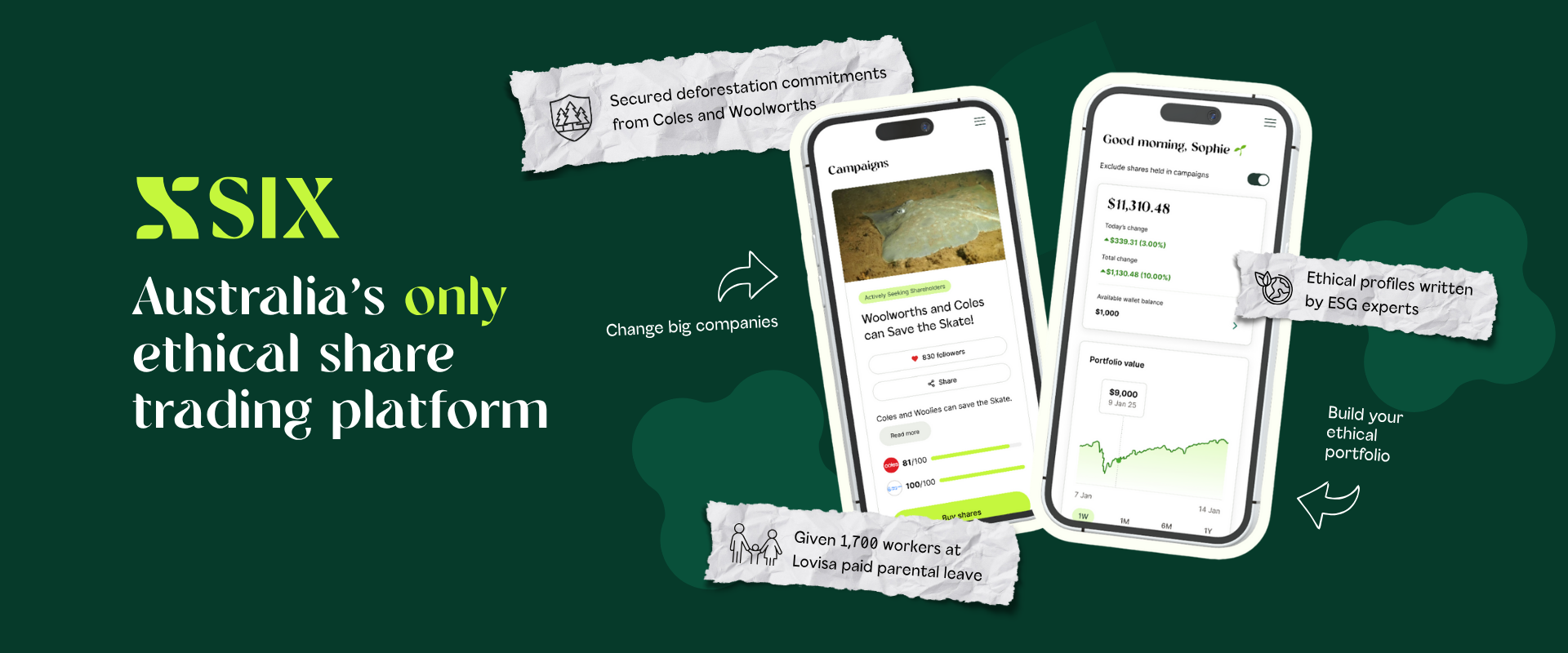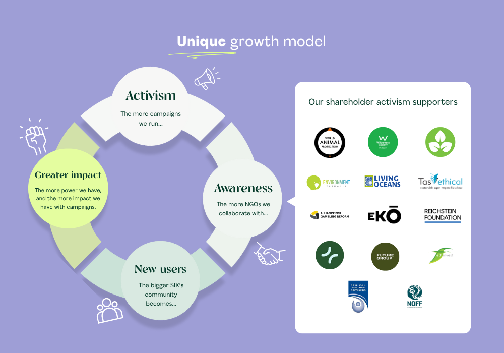 - Tangible campaign wins: In just our first year, SIX has already achieved globally high votes at Coles and Woolworths AGMs to protect the endangered Maugean Skate; pushed healthcare giant CSL Ltd to disclose its gas transition risks; secured access to paid parental leave for 1,700 Lovisa workers; and forced Webjet to drop animal cruelty tourism.