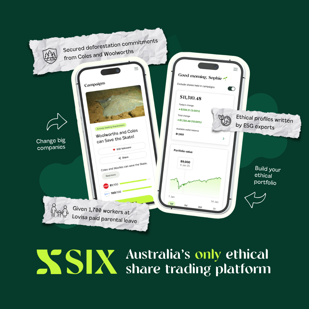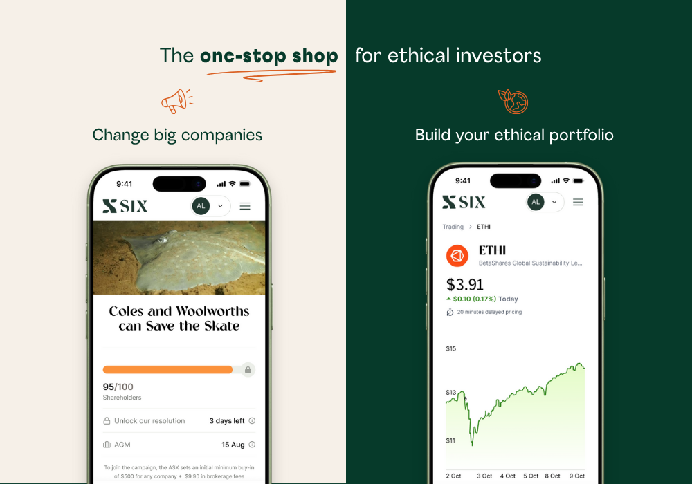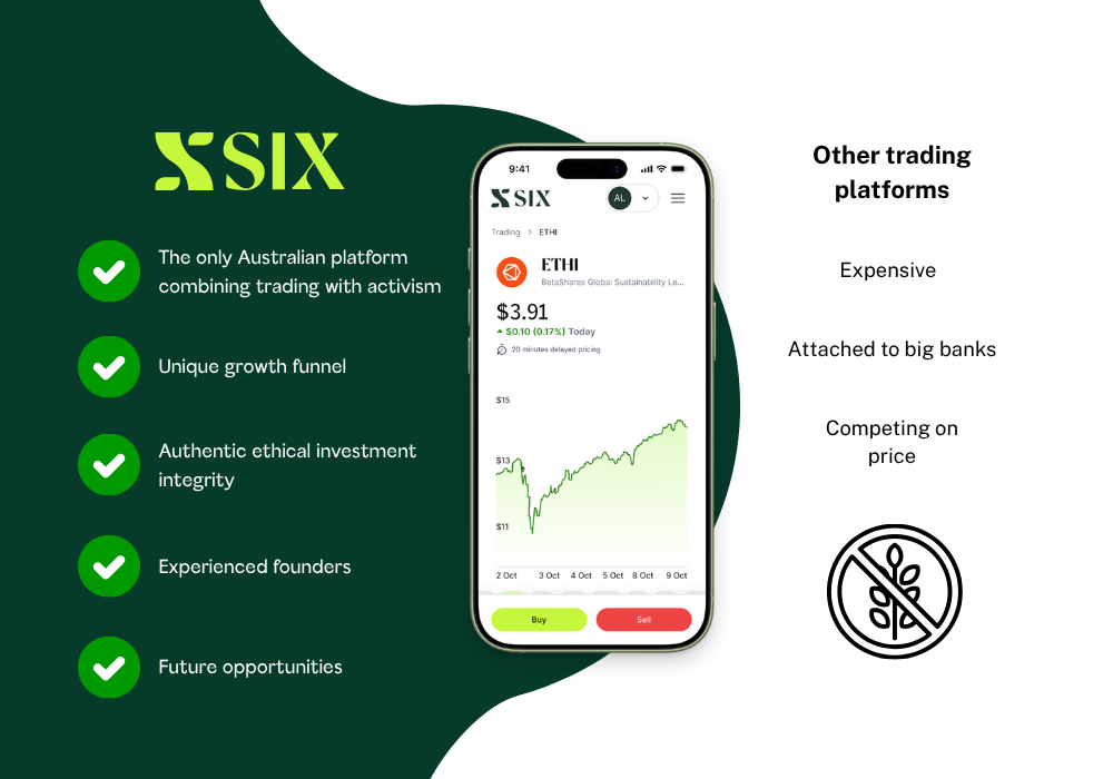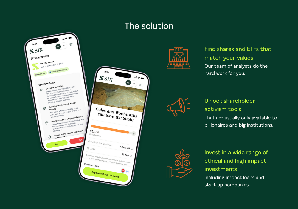 SIX is Australia’s only online share trading platform designed specifically for ethical and impact investors, and the first fintech to combine activism with investing.