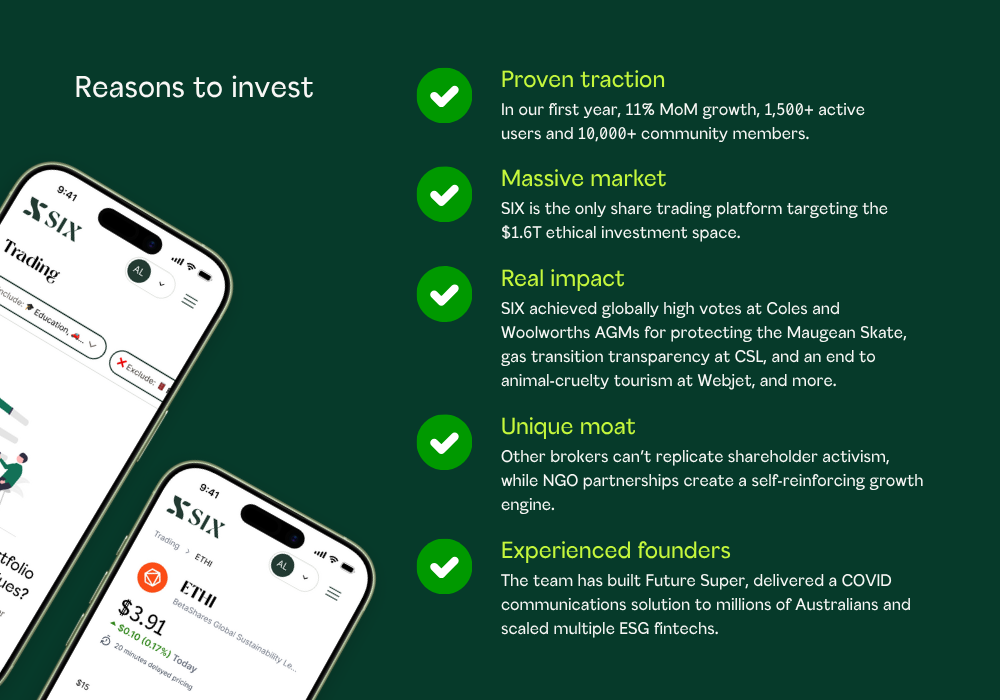 With new capital, we will scale this model to reach more than 10,000 users, launch our Adviser Platform, and expand into new ethical finance products. Our goal is to make SIX the go-to platform for values-driven investors in Australia.