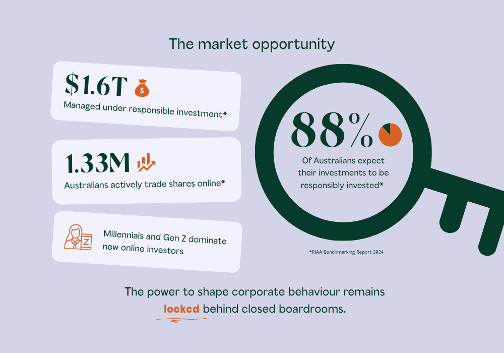 The last decade has seen huge growth in both online investing and responsible investment. Yet despite this $1.6 trillion opportunity, no existing broker serves the growing movement of Australians who want their investments to reflect their values.