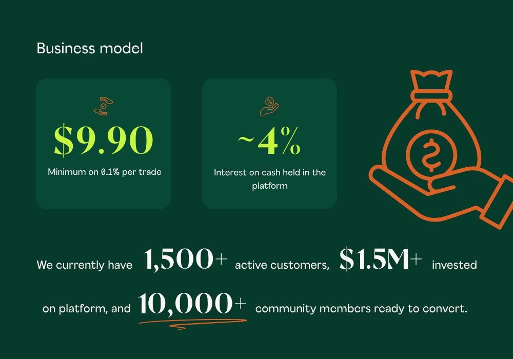 Proven traction: 1,500+ active users and 10,000+ community members in a year, growing at 11% month-on-month.