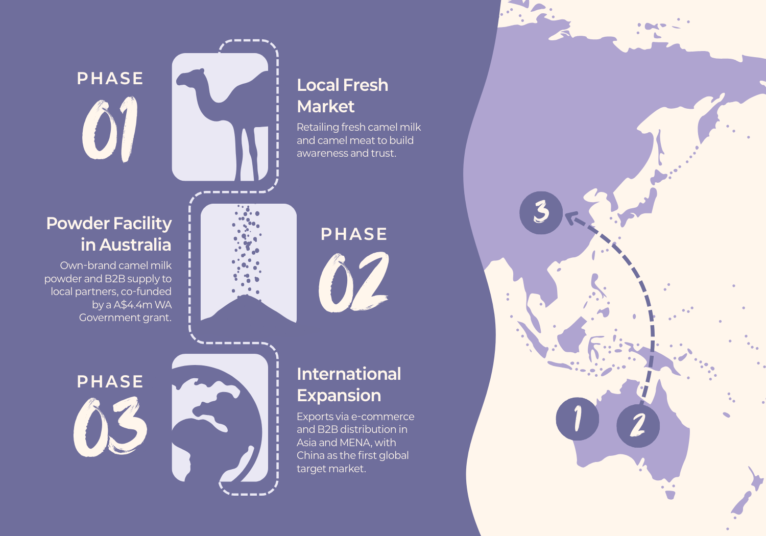 - Phase 2 – Powder Facility in Australia: Own-brand camel milk powder and B2B supply to local partners, co-funded by a A$4.4m WA Government grant.