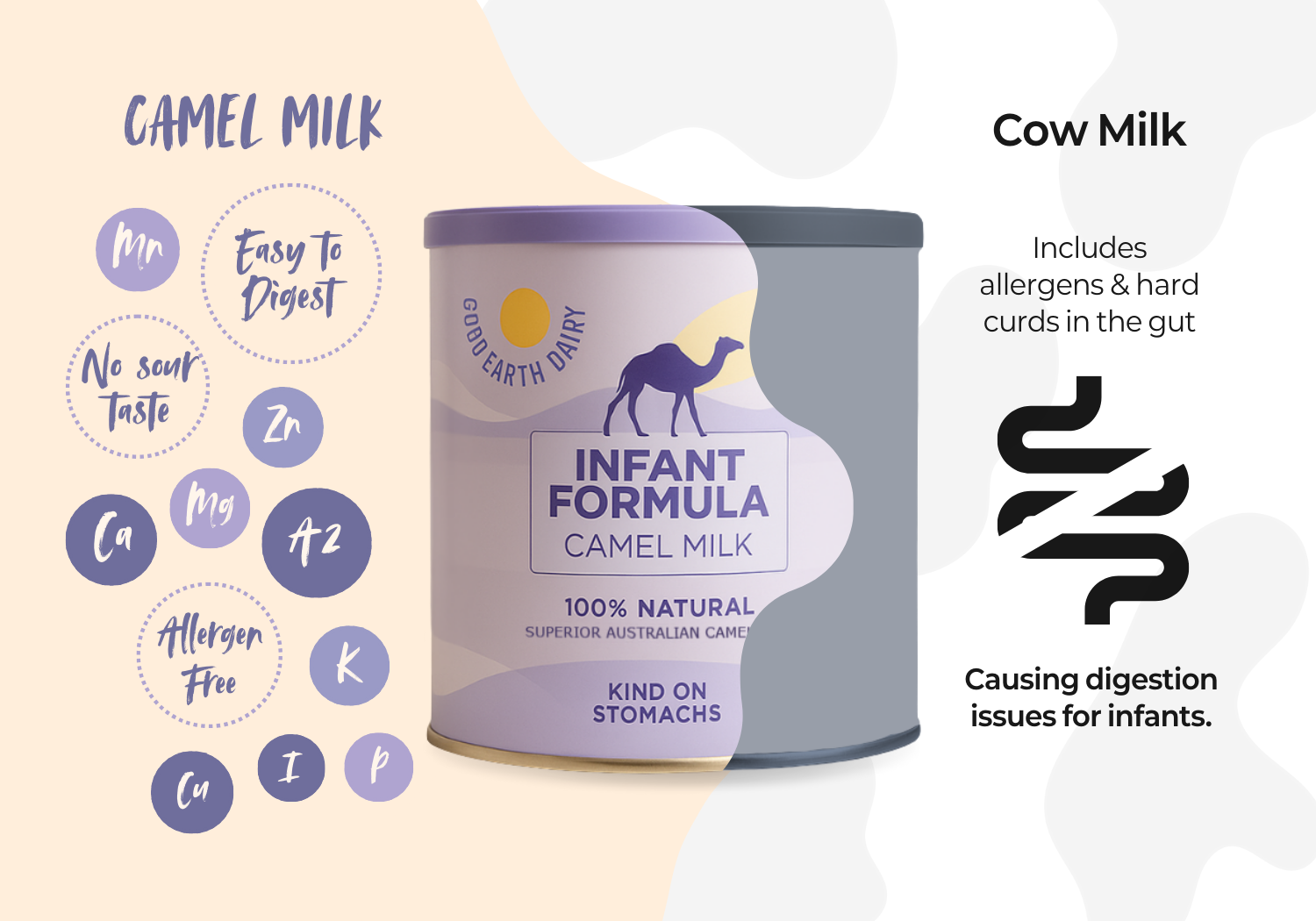 The Solution: Camel milk addresses these issues naturally. It is allergen-free, easy to digest, and has a neutral taste. Molecularly, it is the closest to human milk, making it a uniquely well-suited base for infant nutrition.